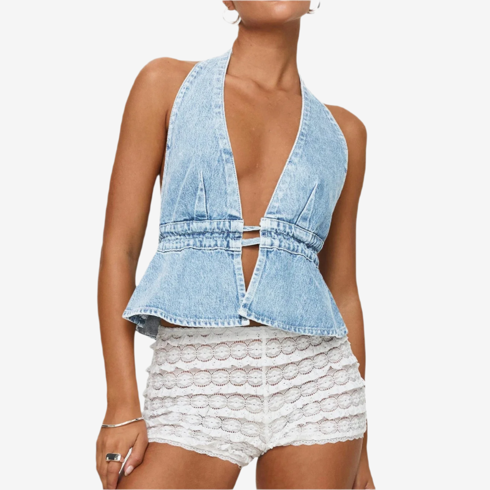 Ce haut dos nu en denim incarne l'audace, le style et l'esprit estival. Avec son décolleté en V plongeant, son dos nu et son nœud à l'arrière, il se marie à merveille avec un short taille haute ou une jupe longue. Sa taille structurée flatte la silhouette, tandis que son dos nu apporte une touche sexy et aérienne.